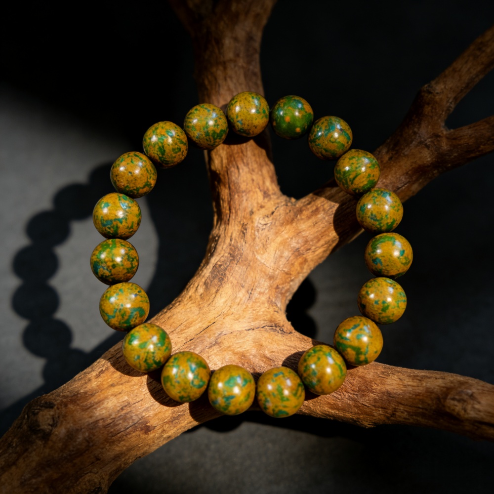 Yellow and green are not dyed, but seep from the veins of the scented clay—like the young poplars sprouting at the foot of the Singing Sand Dunes, or the oxidized azurite hues emerging from the murals of the Mogao Caves. No two beads are alike, just as every grain of sand in Dunhuang holds its own story.The fragrance is drawn from the essence of heaven, earth, and the plants. It clears heat, detoxifies, calms the mind, and nurtures clarity, gently returning the noise of the mundane world to the sea of sand. Dunhuang has never truly faded—it continues its quiet practice upon the wrist of every modern soul yearning for peace.