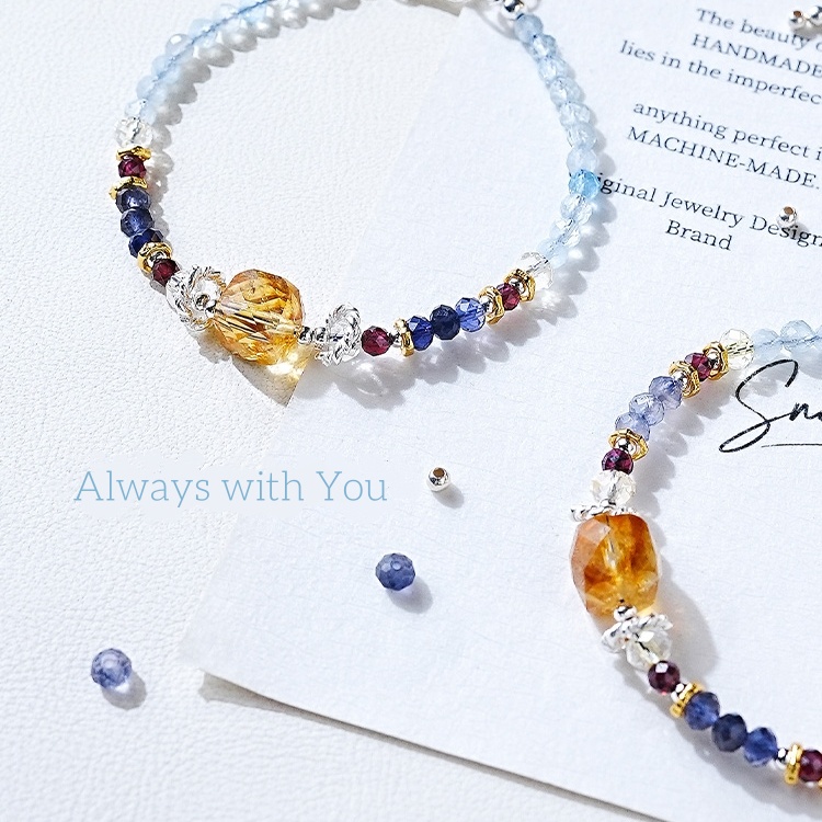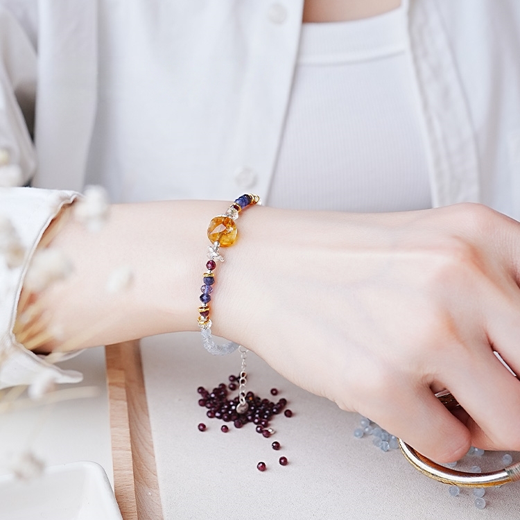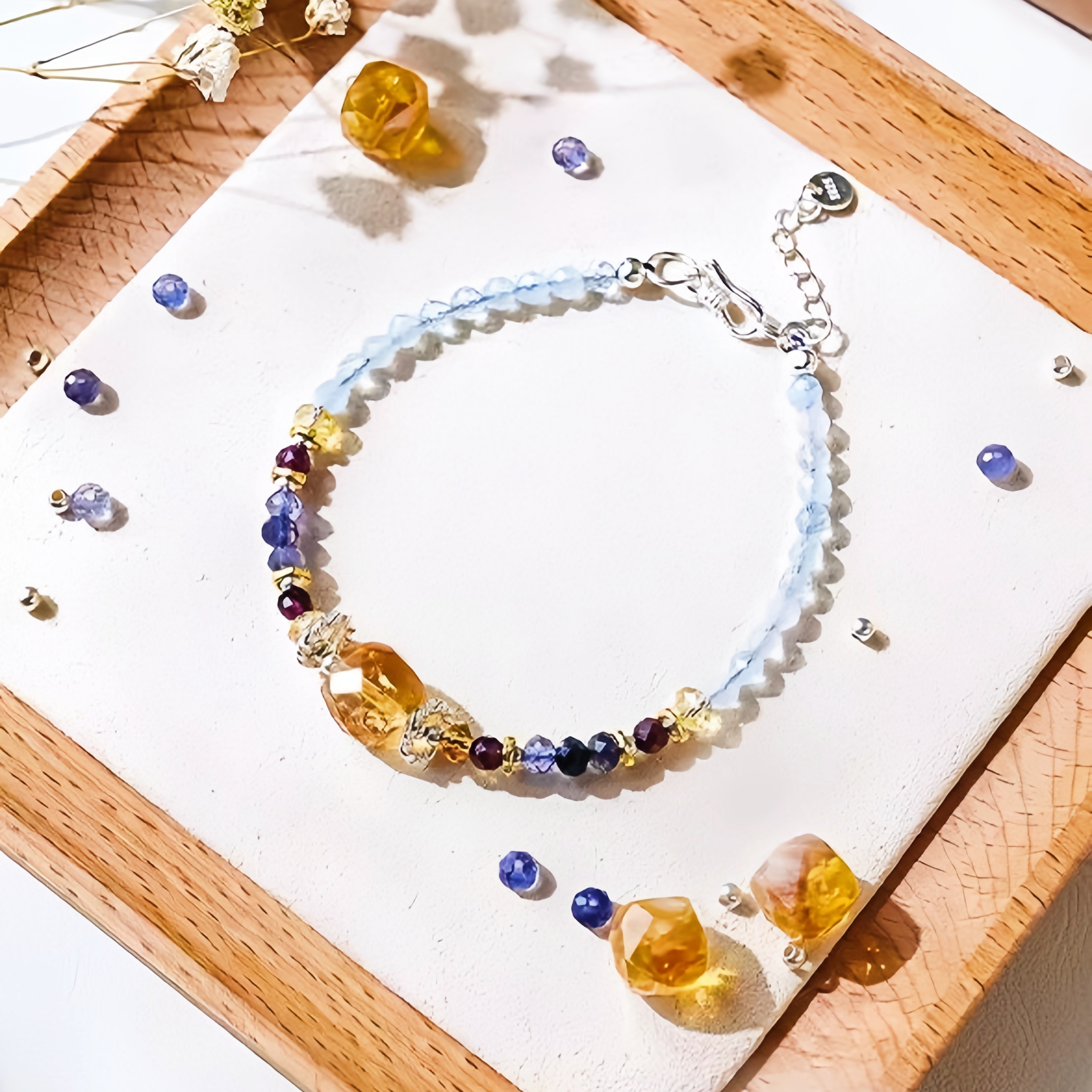 This bracelet transforms a painting’s essence into wearable art. Aquamarine beads mirror dewdrops on blue petals, citrine crystals capture lemon sunlight, and moonstone evokes twilight’s glow. Silver links unite them like brushstrokes, while natural inclusions mimic the artwork’s texture. With every movement, these gems recreate the painting’s color alchemy – cool blues, warm golds and ethereal shimmer dancing together. A portable masterpiece that brings canvas poetry to life through light and motion.