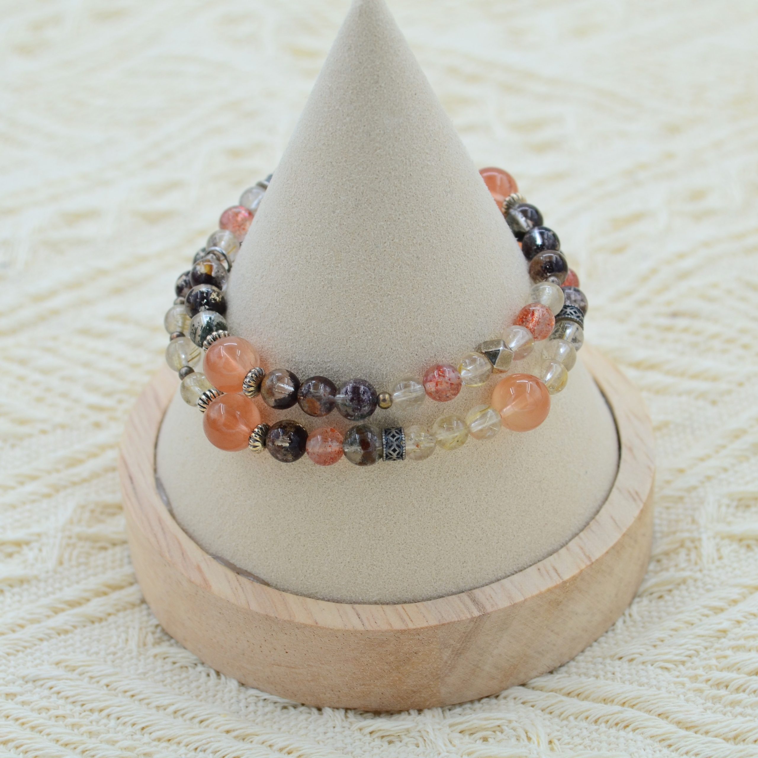 This double-loop bracelet embodies the perfect fusion of nature’s seasonal cycles and cosmic stellar energy. The outer loop features four types of phantom quartz that capture the essence of the seasons – spring’s green phantom quartz with dandelion-like inclusions resembles budding sprouts breathing with earthly vitality; summer’s red phantom quartz burns passionately, its hematite inclusions glowing like sunset embers; autumn’s golden phantom quartz radiates abundance, its layered phantoms reflecting golden wheat fields; winter’s white phantom quartz shines with pristine clarity, its icy cracks like moonlight flowing across snowfields.