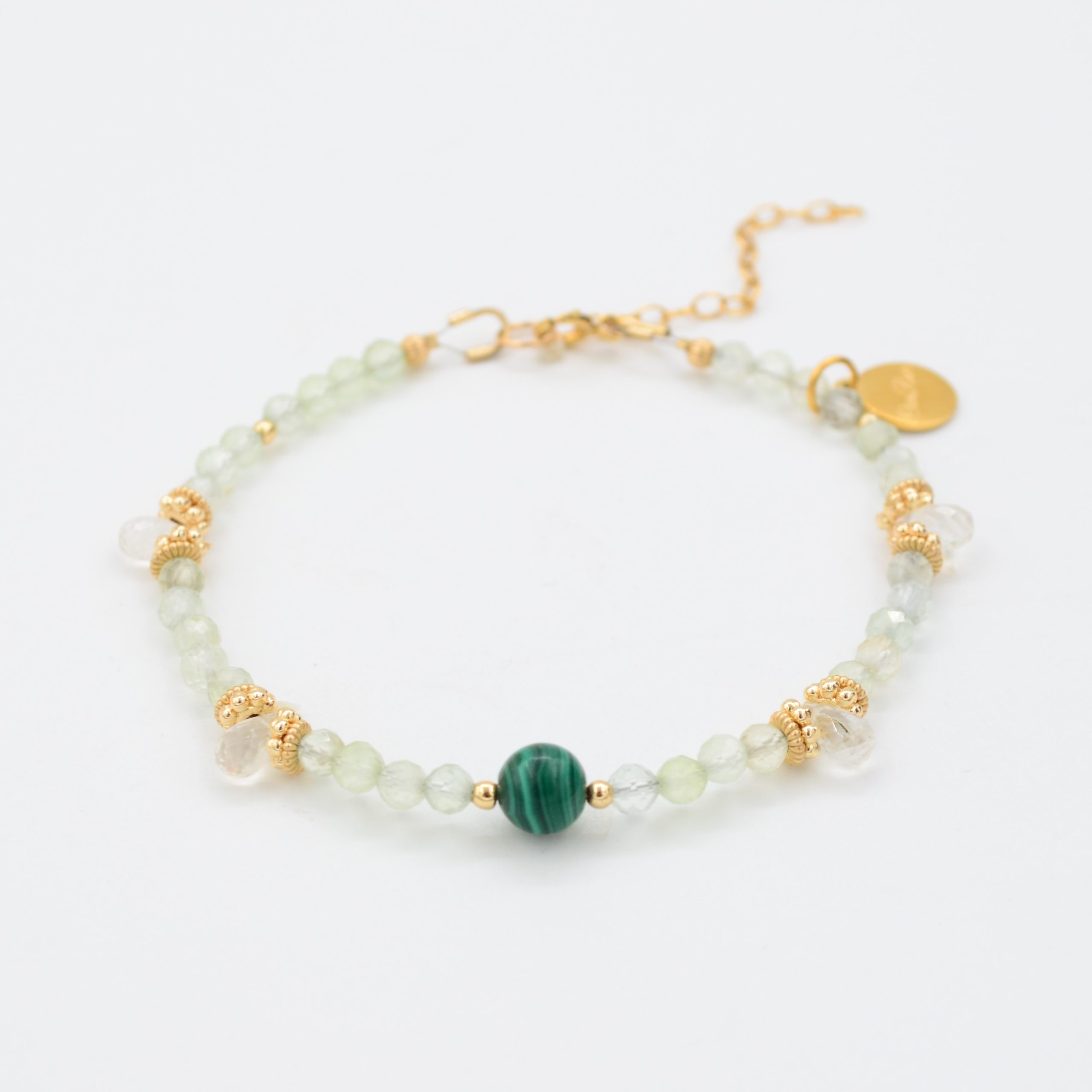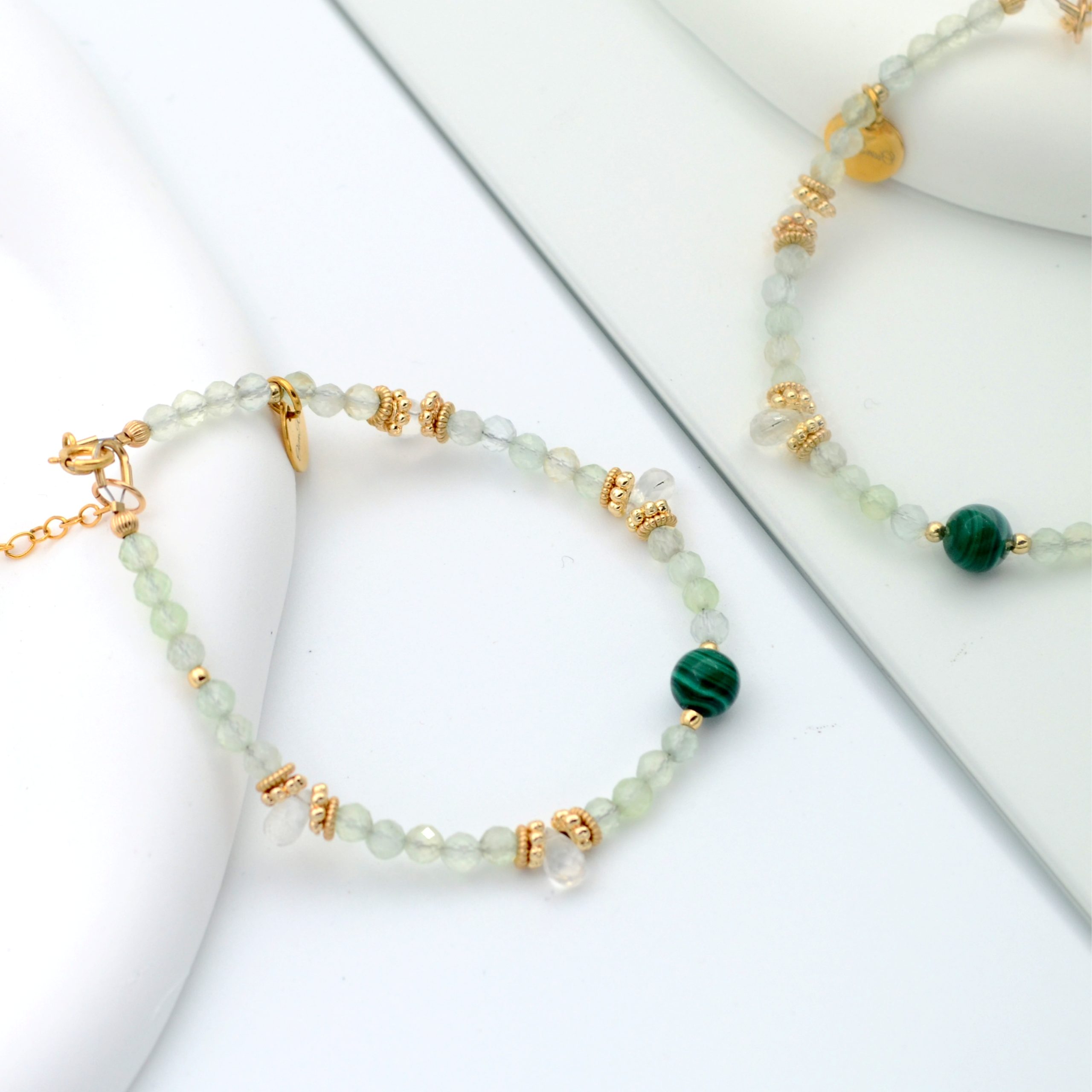 Prehnite’s soft green, like moss after rain, carries freshness; white moonstone, translucent as frost, glows faintly. Malachite’s vivid green, with marble-like veins, has energy. Strung, they mix forest, frost, vitality — a wrist melody. Wearing feels like holding nature’s warmth.