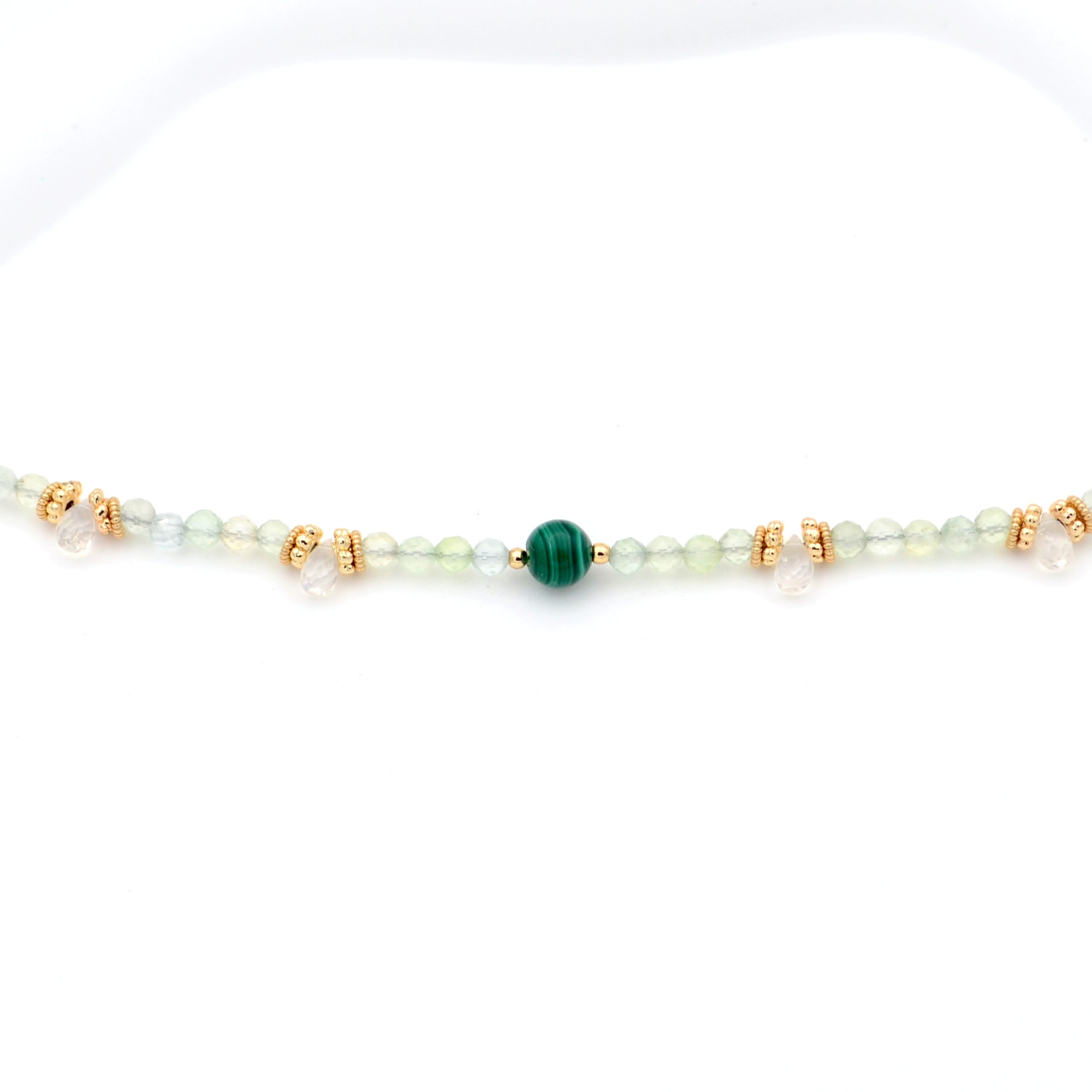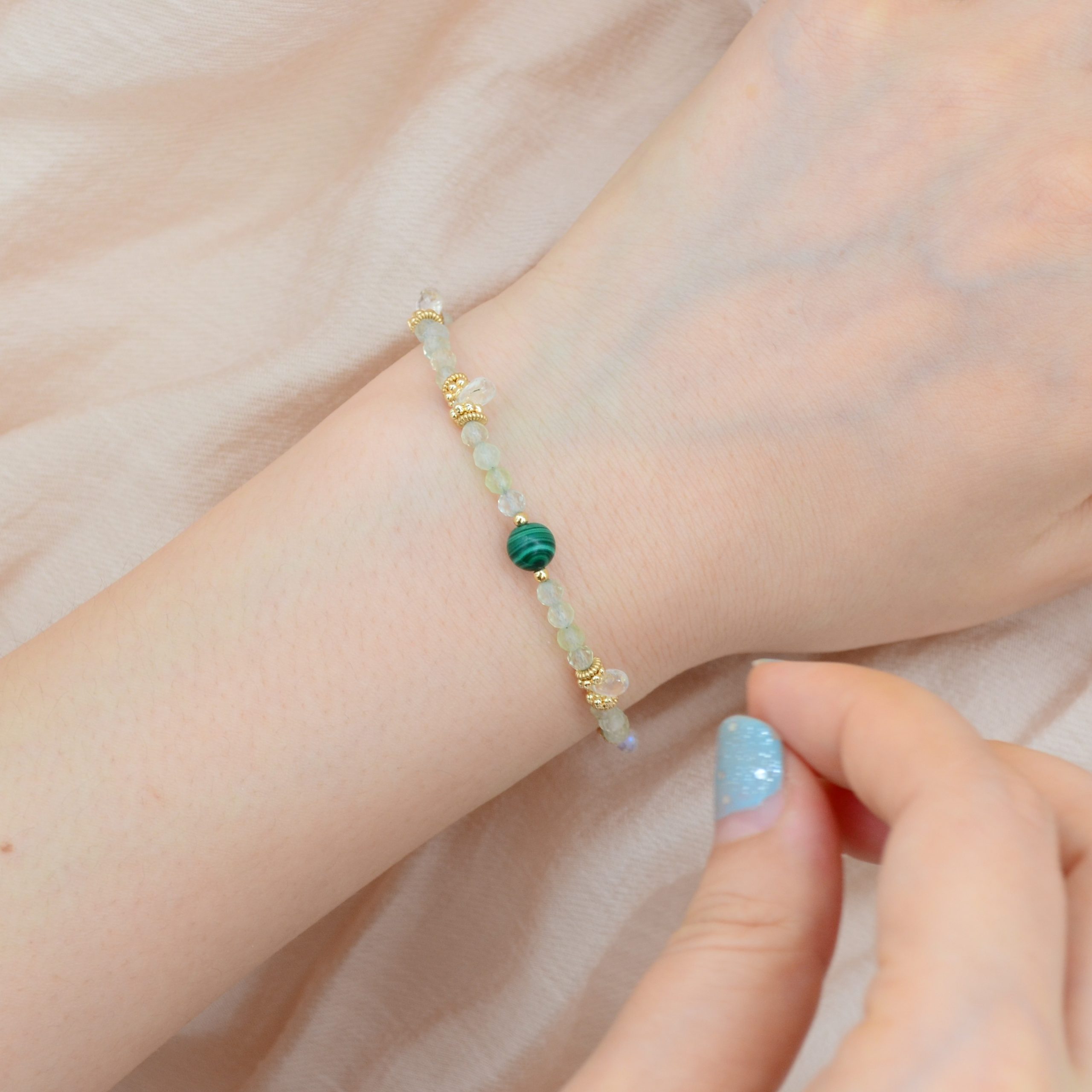 A bracelet strung with these three stones is like a poem twisted around the wrist, combining the spring scenery by the stream, the flowing light under the moon and the vitality of the rainforest. The tenderness of prehnite neutralizes the richness of malachite, and the softness of white moonstone adds a hazy charm to the whole. When you raise your hand, the cool moisture of prehnite, the clarity of moonstone and the solidity of malachite pass through your fingertips in turn, like touching dewy grass leaves, pebbles at the bottom of a stream and damp moss.
