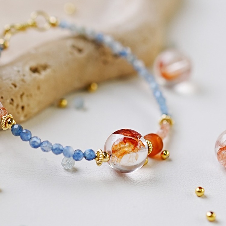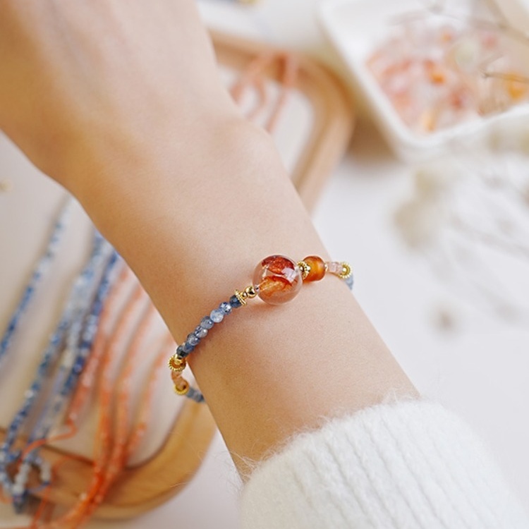 This bracelet design draws inspiration from the fusion of earth and sunlight, blending kyanite, sunstone, rutilated quartz, and vintage glass beads to create a piece that embodies the synergy of nature and energy. The deep blue of kyanite evokes the mystique of glacial depths, setting a serene yet enigmatic foundation. Sunstone, with its shimmering golden aventurescence, infuses warmth and vitality, like sunlight piercing through clouds, forming a striking contrast with the cool tones of kyanite. The fiery orange-red rutile inclusions in the quartz add a fantastical touch, resembling the pulsating energy of the earth’s core. The matte tea-brown vintage glass beads, subtly textured with weathered cracks, lend a sense of timelessness, grounding the design with an earthy, weathered elegance that balances the vibrancy of the other stones.