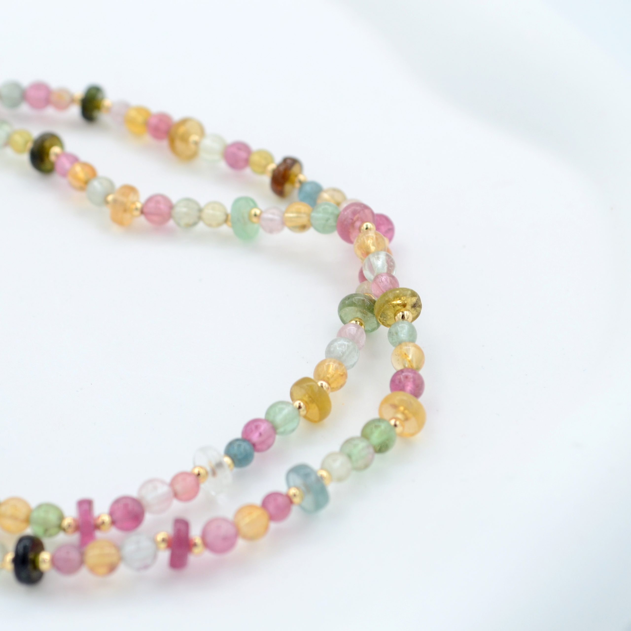 Pastel tourmalines with frosted finishes create dreamy gradients. Dual strands feature vibrant inner layer and soft outer tones, accented by gold beads for dessert-like elegance. Light refracts into rainbows through natural fissures, while movable design allows colors to blend like a sweet symphony on the wrist.