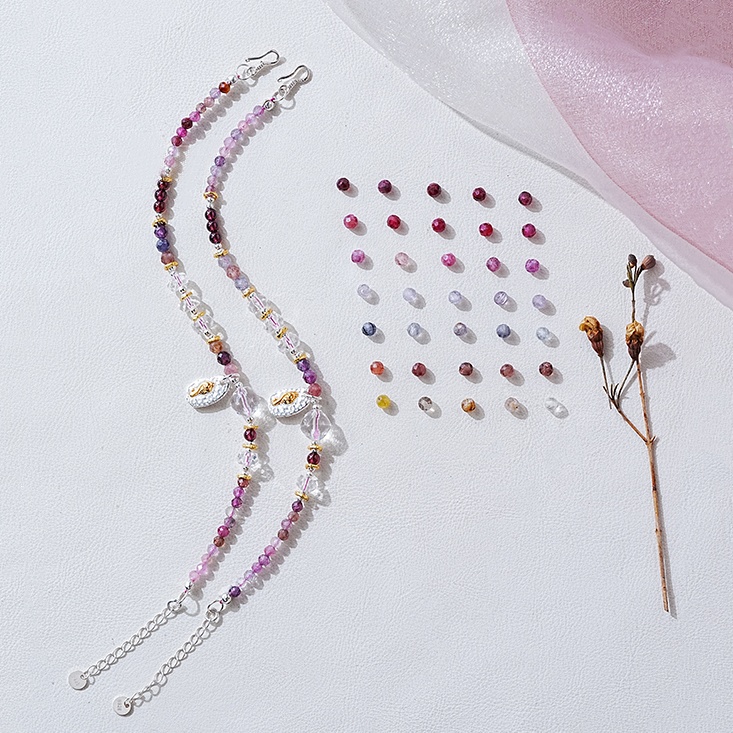 Inspired by “galactic star trails,” this creation interweaves the cosmic neon hues of colored spinel, the deep-space crimson of garnet, and the pure starlight of clear quartz into a celestial tapestry. The featured stones include rare cobalt spinel cut into asymmetric kite shapes evoking pulsars, and demantoid garnet with rose cuts showcasing its distinctive horsetail inclusions – resembling nebula remnants. Clear quartz beads feature double-pyramid cuts that project rainbow flares at specific angles, mimicking gravitational lensing effects.