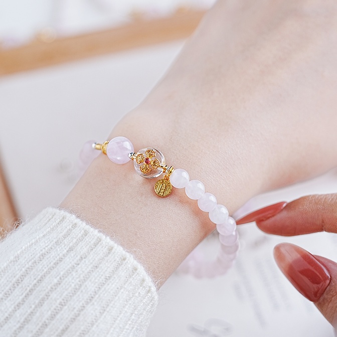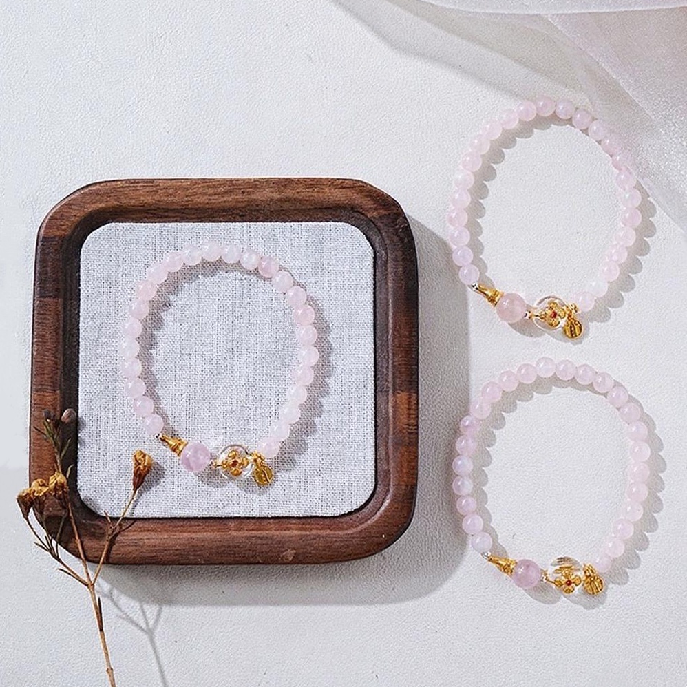 The delicate interplay of morning cherry blossoms and ancient temple spires inspired this bracelet. The rose quartz’s soft matte finish evokes flower petals, while the white quartz clover shimmers like dewdrops. The gold-plated pagoda captures the elegant lines of traditional eaves. A harmonious clash of misty pink and antiqued gold creates a visual rhythm that balances tenderness and solemnity.