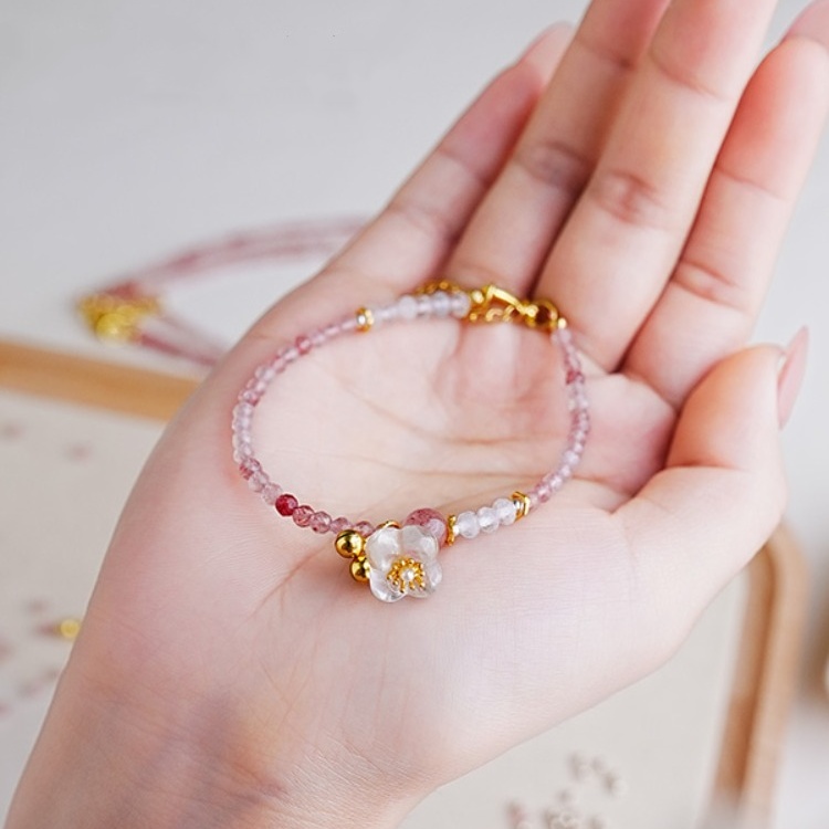 Energetically, the strawberry quartz attracts love, the white topaz enhances communication, and the white quartz purifies the aura, forming a holistic emotional healing cycle. A unique feature is the detachable osmanthus branch, which transforms into a brooch for versatile wear. When light filters through the layered materials, it casts delicate speckled shadows on the skin, like the enchanting “flower snowstorm” of cherry blossom season.