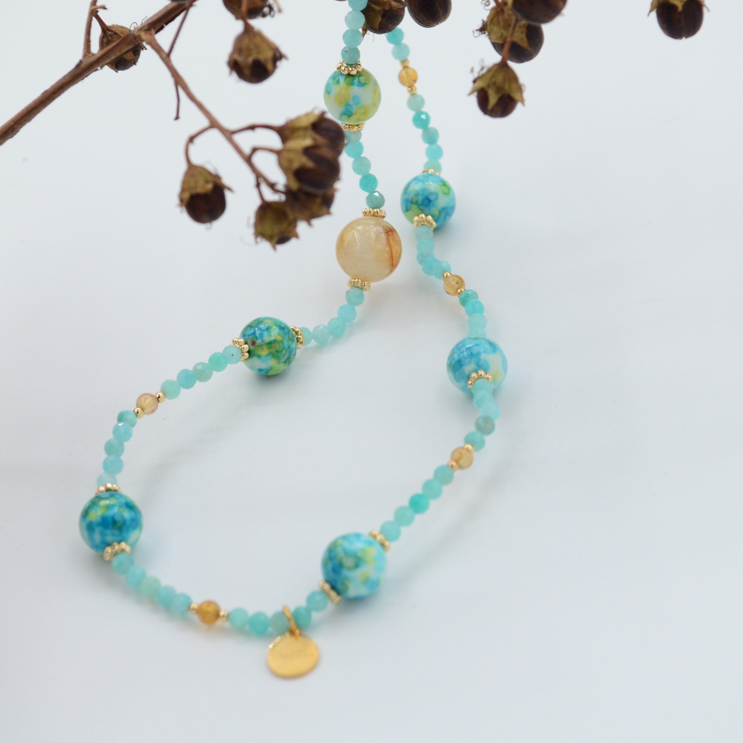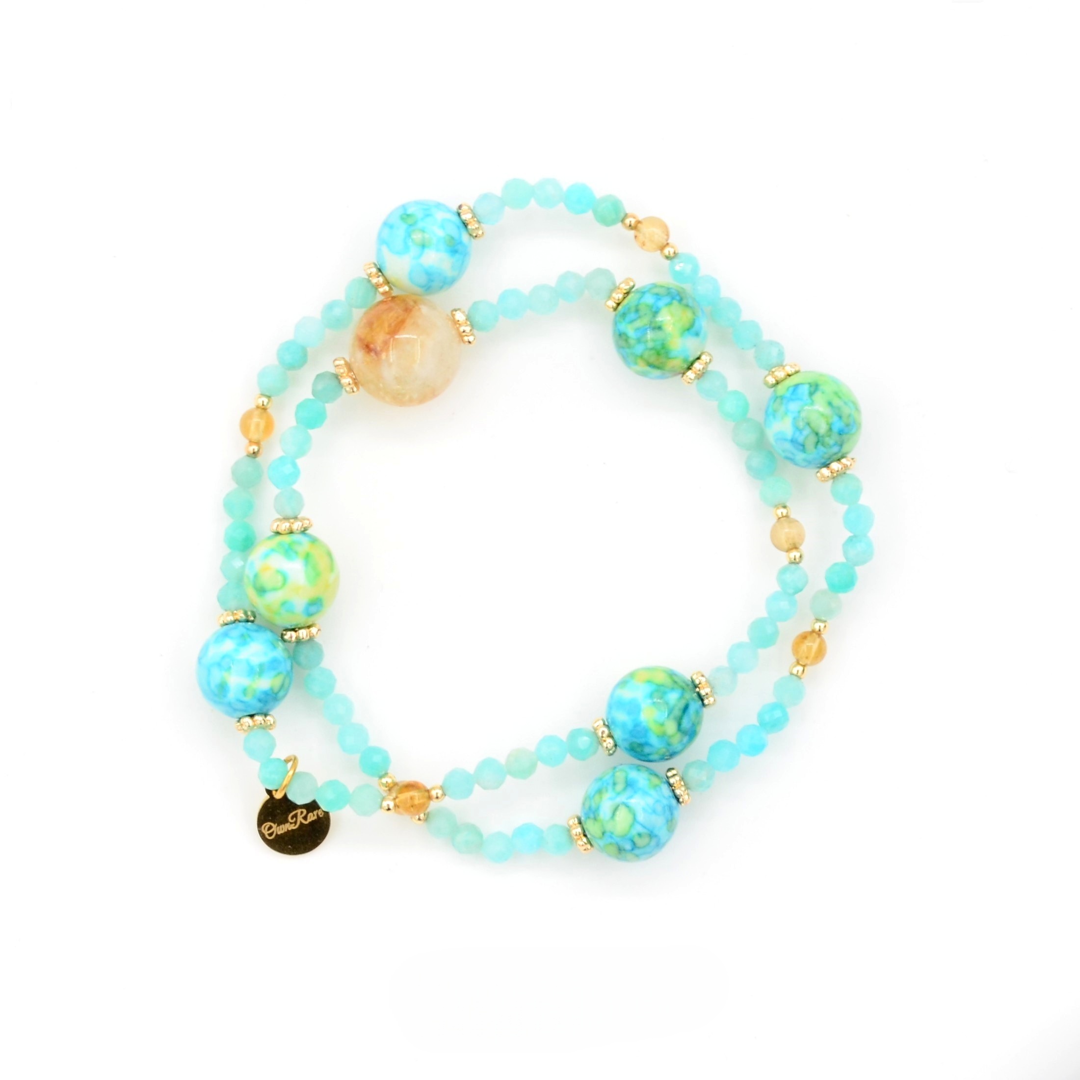 This double-strand bracelet draws inspiration from the vibrant clash of colors in a summer meadow. The outer strand features matte-finish amazonite beads, their translucent blue-green hues resembling sunlight filtering through shallow waters, with delicate white veining inside each bead like frozen sea foam. The inner strand intertwines yellow tourmaline and yellow-green painted glass beads—the tourmaline’s vivid brilliance paired with the glass’s impressionistic brushstrokes creates a dynamic gradient, evoking golden ripples of wheat swaying in the breeze.
