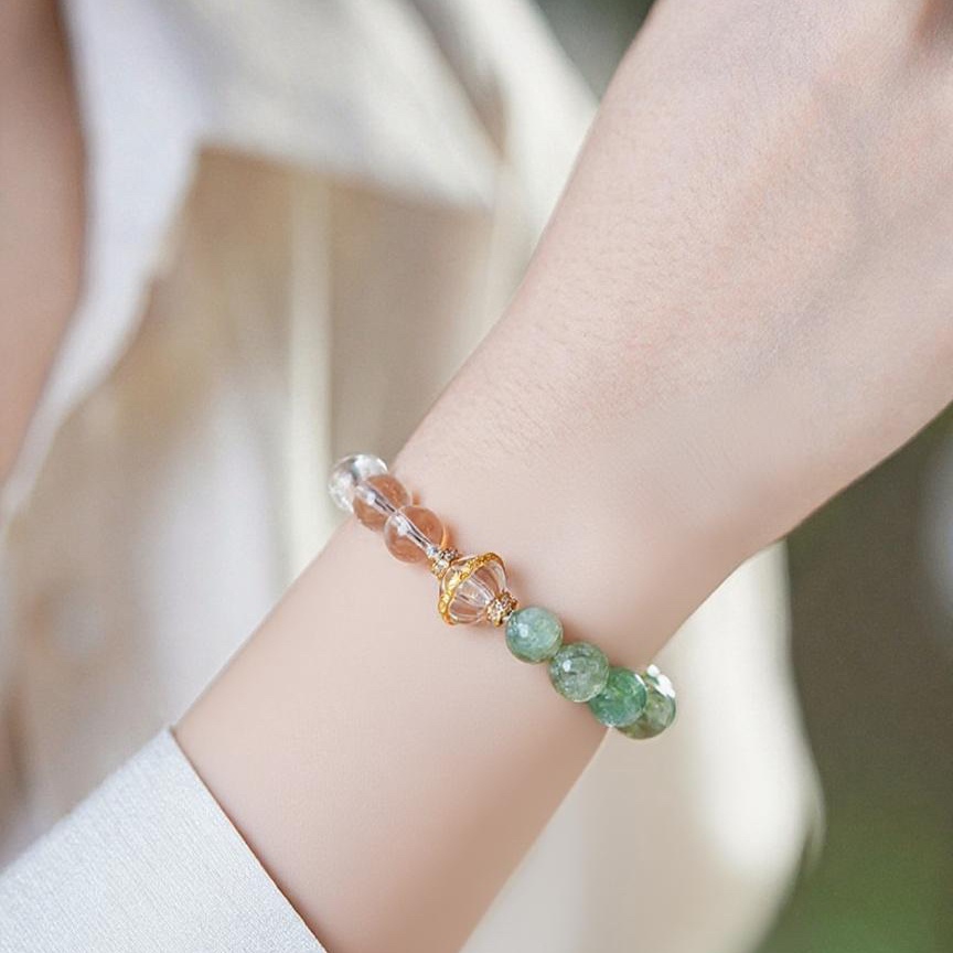 Inspired by a “Midsummer Night’s Forest,” this piece artfully weaves together the moss-like texture of fuchsite, the dewy clarity of white quartz, and the rosy hues of pink quartz through organic pumpkin-carved crystals. The fuchsite beads retain their natural matte finish with untreated layered structures, emitting subtle silky luster when moved, reminiscent of fireflies flickering through foliage. The white quartz centerpiece is innovatively carved into a hollow pumpkin shape with an internally iridescent coating, refracting rainbow prisms through its hand-etched surface patterns.