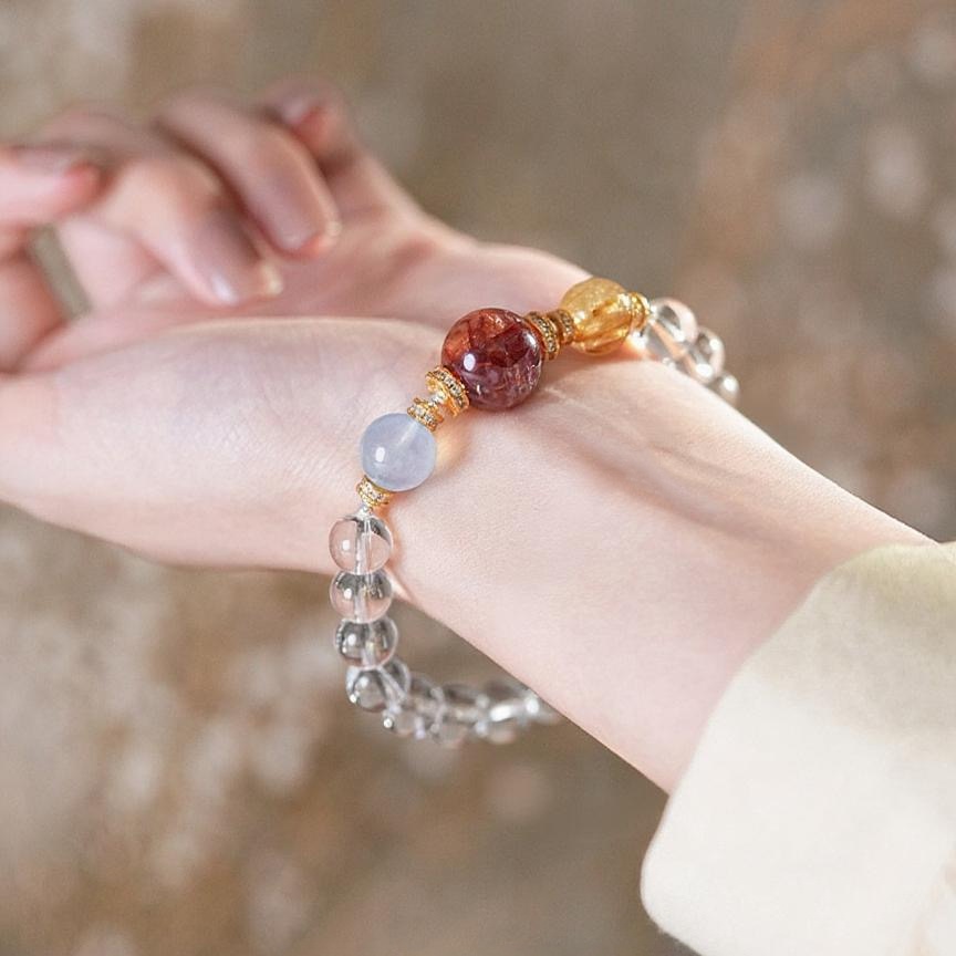 The three gemstones’ energies intertwine through the quartz’s conductivity: aquamarine calming emotions, rutilated quartz igniting passion, and golden rutilated quartz attracting prosperity, forming a self-renewing energy circuit around the wrist. When fingers trace the strand, the gems chime distinctively—aquamarine’s wave-crashing notes, rutilated quartz’s fire-crackling tones, and golden rutilated quartz’s coin-clinking resonance—all harmonizing against the quartz’s pure acoustics. At certain angles, sunlight pierces through the beads to project a miniature rainbow on surfaces, its arc connecting aquamarine to rutilated quartz while golden rutilated quartz becomes the bridge’s radiant zenith.